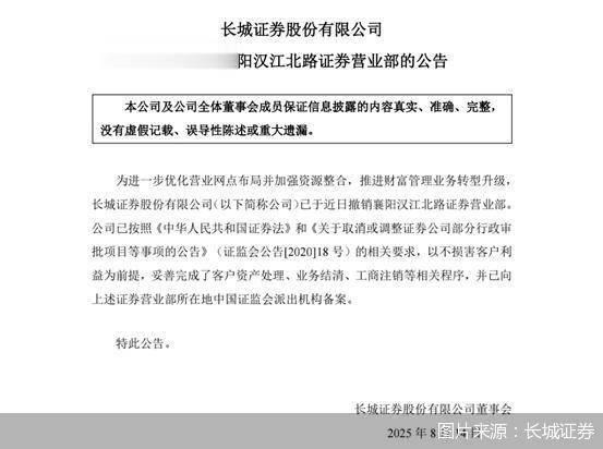 又见券商撤销旗下营业网点。8月13日,长城证券发布公告表示,为进一步优化营业网点布局并加强资源整合,推进财富管理业务转型升级,长城证券已于近日撤销襄阳汉江北路证券营业部。年报显示,截至2024年末,长城证券曾共设有营业部111家。